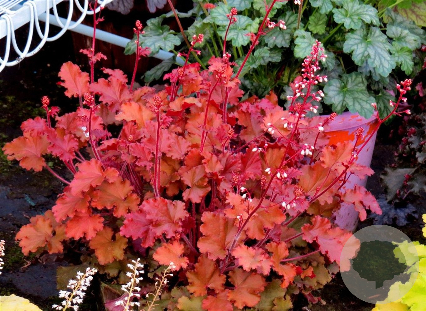 ToelichtingHet Purperklokje (Heuchera 'Peach Crisp') is een prachtige vaste plant met groen/paars blad en witte bloemen. Deze plant bloeit van juni tot augustus en gedijt goed in de halfschaduw op neutrale of humusrijke grond. Bereikt een hoogte van 30 cm.