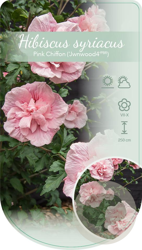 | Toelichting | De Hibiscus syr. Pink Chiffon is een prachtige struik met roze bloemen die bloeien van juli tot september. Deze Hibiscus gedijt het beste in zon en halfschaduw op goede tuingrond of humusrijke grond. Bereikt een volwassen hoogte van 200 cm. |