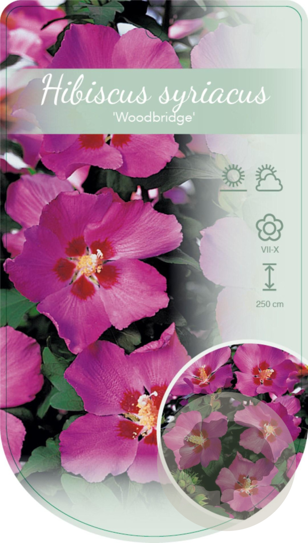 | Toelichting | Hibiscus is een prachtige struik met roze bloemen en groen blad. Bloeit van juli tot september en gedijt goed in zon en halfschaduw op lichte klei, neutrale grond of goede tuingrond. Bereikt een hoogte van 150 cm. |
