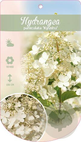 | Toelichting | De Hortensia 'Kyushu' is een prachtige struik met roze bloemen en groen blad. Deze hortensia bloeit van juli tot september en gedijt het beste in de halfschaduw op zure en humusrijke grond. De volwassen hoogte is ongeveer 150 cm. |