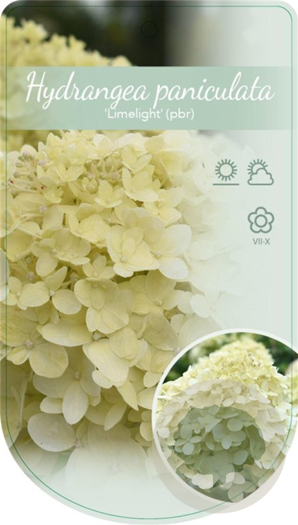 | Toelichting | De Hortensia 'Limelight' is een prachtige struik met opvallende groen-witte bloemen die bloeien van juli tot september. Deze hortensia gedijt het beste in zon of halfschaduw op zure, voedselrijke en humusrijke grond. Bereikt een hoogte van 150 cm. |