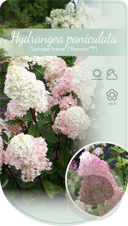 | Toelichting | De Pluimhortensia (Hydrangea pan. Sundae Fraise) is een prachtige struik met roze bloemen die bloeien van juli tot september. Deze hortensia houdt van een standplaats in de halfschaduw en gedijt goed op zure, humusrijke grond. Een aanwinst voor elke tuin! |