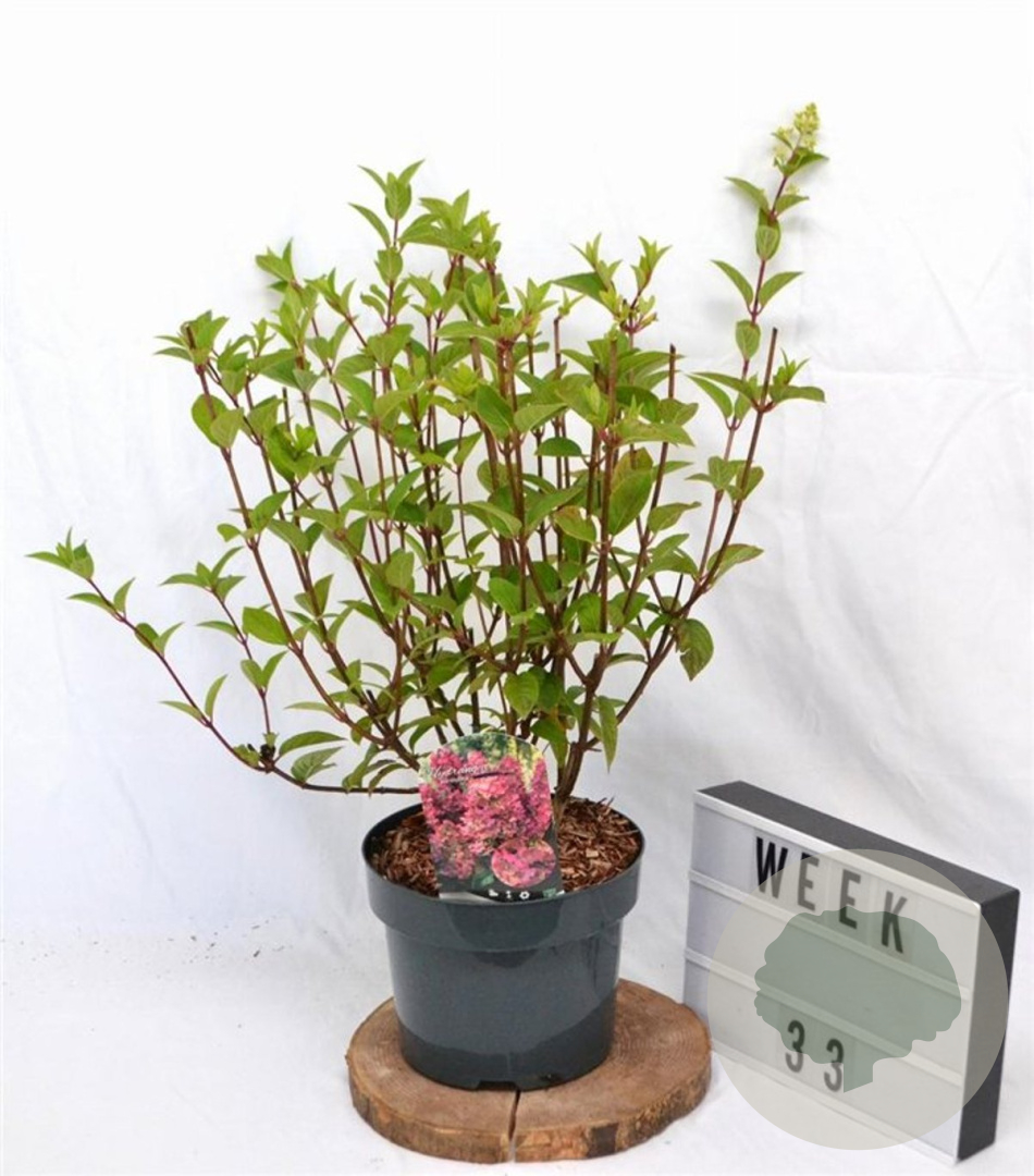 | Toelichting | De Pluimhortensia (Hydrangea pan. Sundae Fraise) is een prachtige struik met roze bloemen die bloeien van juli tot september. Deze hortensia houdt van een standplaats in de halfschaduw en gedijt goed op zure, humusrijke grond. Een aanwinst voor elke tuin! |