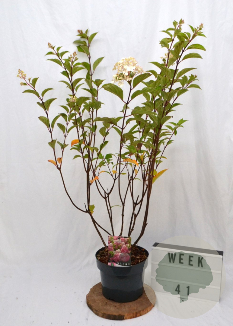 | Toelichting | De Pluimhortensia (Hydrangea pan. Vanille-Fraise) is een prachtige heester met witte bloemen die langzaam verkleuren naar roze. Deze hortensia bloeit van juli tot september en gedijt goed in zon en halfschaduw op zandgrond, lichte klei of neutrale grond. |