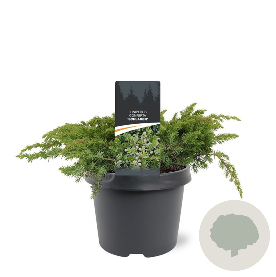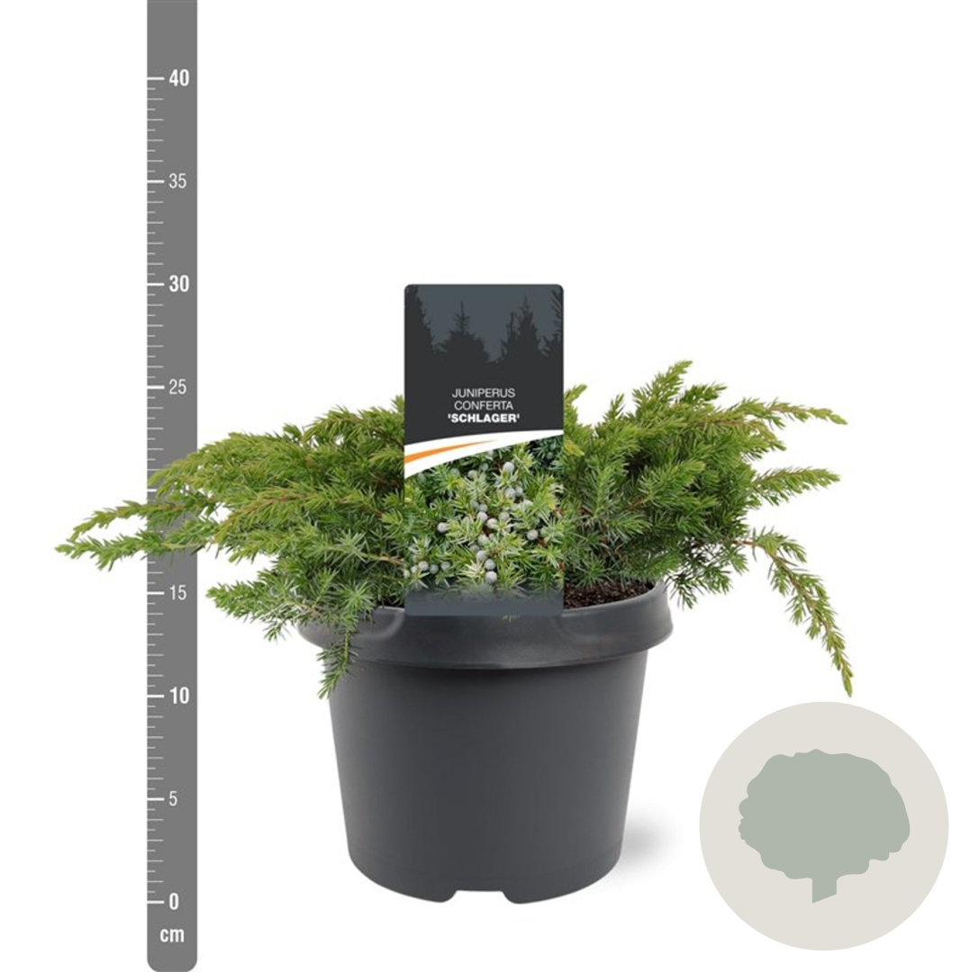 | Toelichting | De Jeneverbes 'Schlager' is een groenblijvende bodembedekker met een compacte groei. De plant heeft groene naaldachtige bladeren en gedijt goed in zonnige standplaatsen. Perfect voor zandgrond, klei, lichte klei, zure grond en kalkrijke grond. |
