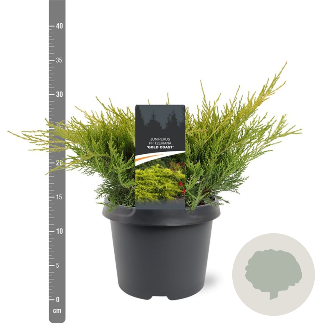 | Toelichting | De Jeneverbes 'Gold Coast' is een prachtige conifeer met opvallend geel blad. Deze plant wordt ongeveer 150 cm hoog en gedijt goed in de volle zon op zandgrond, klei of neutrale grond. Perfect voor een kleurrijke toevoeging aan de tuin. |