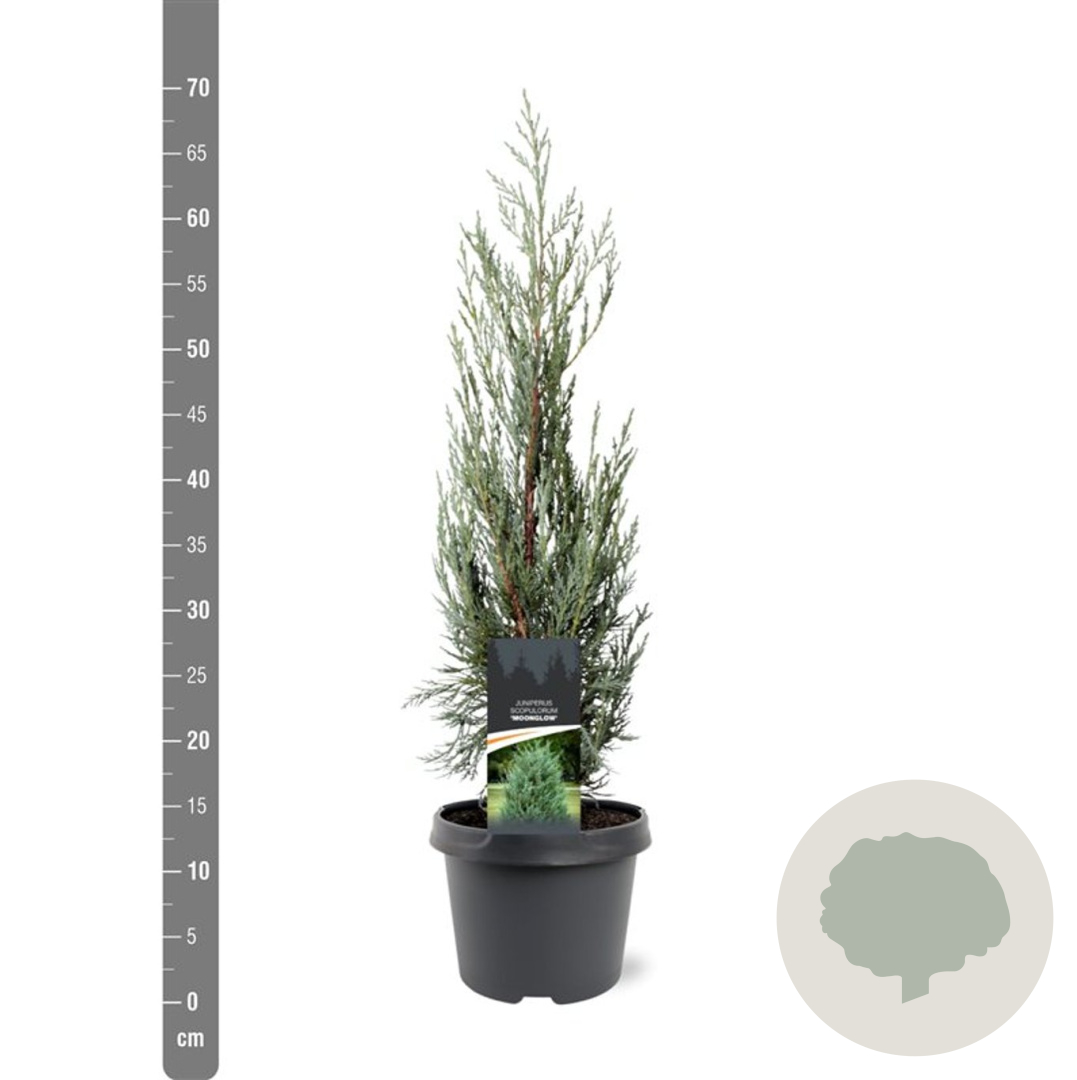 ToelichtingDe Jeneverbes 'Moonglow' is een prachtige conifeer met geelgroene bloemen in mei - juni. Deze niet-inheemse plant gedijt het beste in de volle zon op zandgrond, neutrale grond of goede tuingrond. De volwassen hoogte is ongeveer 200 cm.