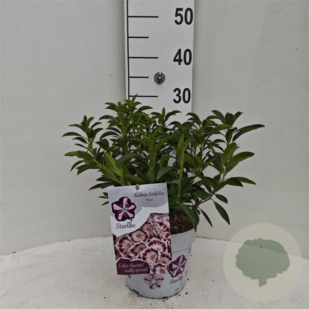 | Toelichting | De Laurierroos (Kalmia lat. 'Nani') is een prachtige struik met roze bloemen en donkergroen blad. Deze plant bloeit in mei en juni en gedijt goed in zon en halfschaduw op zure, humusrijke grond. |