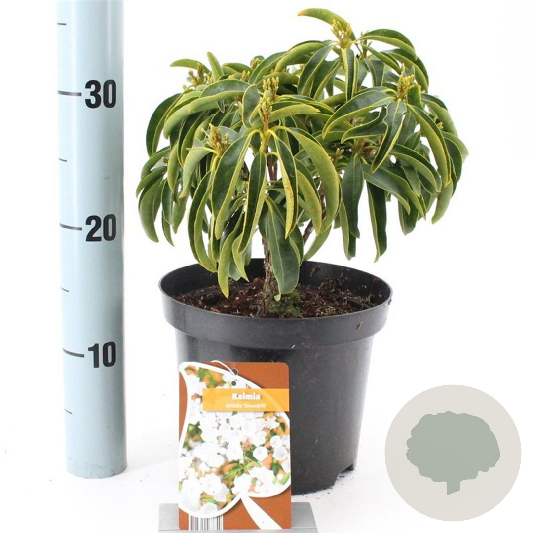 | Toelichting | De Laurierroos, ook bekend als Kalmia 'Snowdrift', is een prachtige heester met witte bloemen in de periode mei - juni. De plant gedijt goed in zon en halfschaduw op zure grond, goede tuingrond of humusrijke grond. Bereikt een hoogte van 150 cm. |