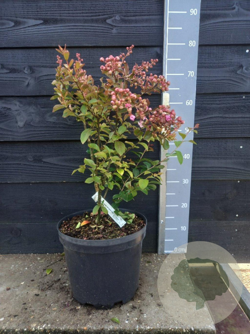 | Toelichting | Lagerstroemia, ook wel bekend als Crape Myrtle, is een prachtige sierstruik met roze bloemen en groen blad. Deze plant bloeit van juli tot september en gedijt het beste in de volle zon op zandgrond, neutrale grond of goede tuingrond. |
