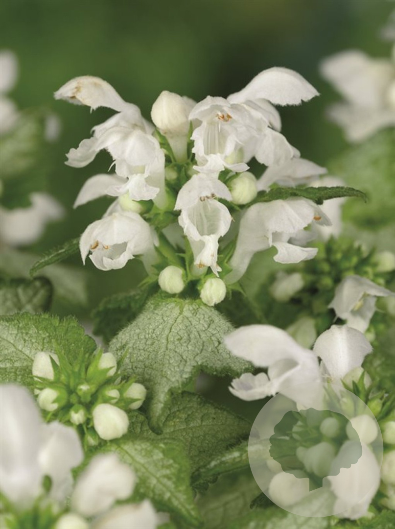 | Toelichting | De Dovenetel (Lamium mac. 'White Nancy') is een prachtige bodembedekker met witte bloemen en groen blad. Bloeit van mei tot augustus en gedijt goed in zon en halfschaduw op lichte klei, neutrale of humusrijke grond. Bereikt een hoogte van 30 cm. |