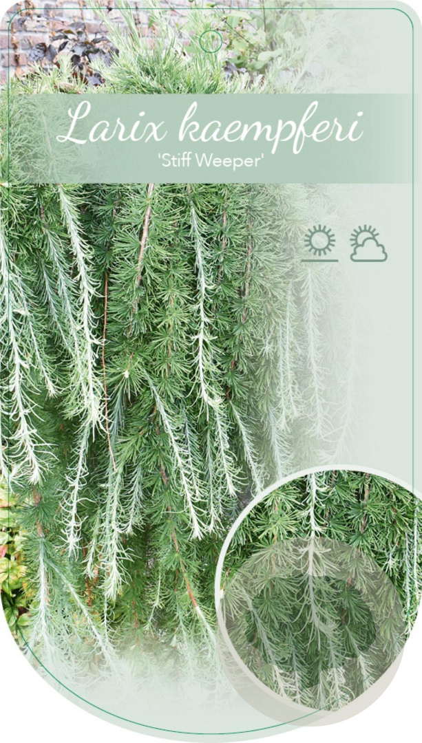 | Toelichting | De Larix kaempf. 'Stiff Weeper', ook wel Lork genoemd, is een prachtige naaldboom met hangende takken en geelgroene bloemen in april en mei. Deze boom wordt ongeveer 300 cm hoog en gedijt goed in zonnige gebieden op zandgrond, lichte klei of neutrale grond. |
