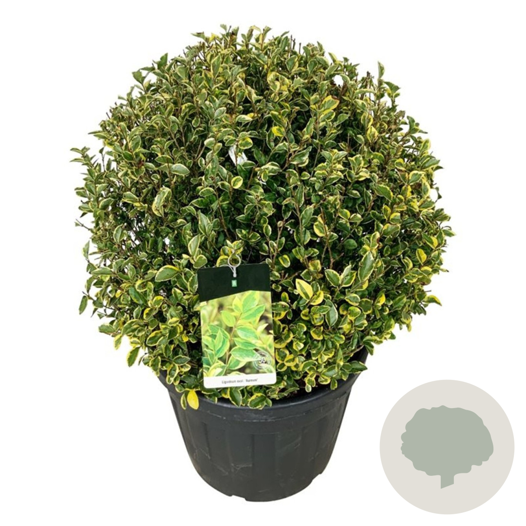 | Toelichting | De Liguster (Ligustrum oval. 'Aureum') is een prachtige heester met geel blad en witte bloemen in juni-juli. Deze niet-inheemse plant gedijt goed in zon en halfschaduw op neutrale, voedselrijke grond. Bereikt een hoogte van 200 cm en is ideaal voor een kleurrijke tuin. |
