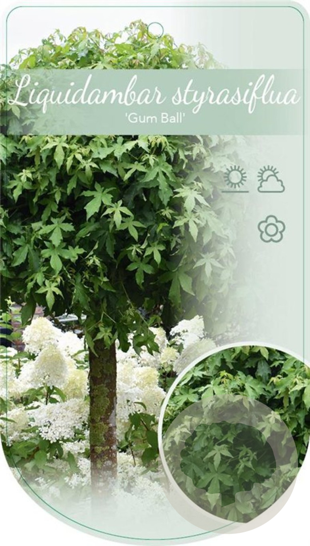| Toelichting | De Amberboom 'Gum Ball' is een compacte sierboom met groen blad en groene bloemen in mei - juni. Hij wordt ongeveer 150 cm hoog en gedijt goed in zon en halfschaduw op zandgrond, lichte klei of neutrale grond. |