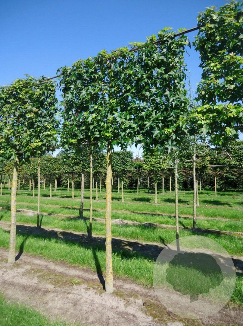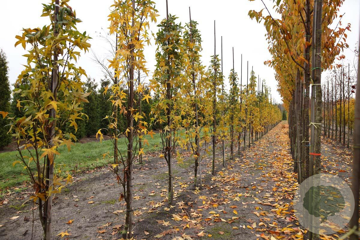 Liquidambar styraciflua (amberboom) kopen? Hoogstam solitairboom 12-14 cm stamomtrek, containergekweekt. Sierlijke boom met glanzend blad en spectaculaire herfstkleuren.