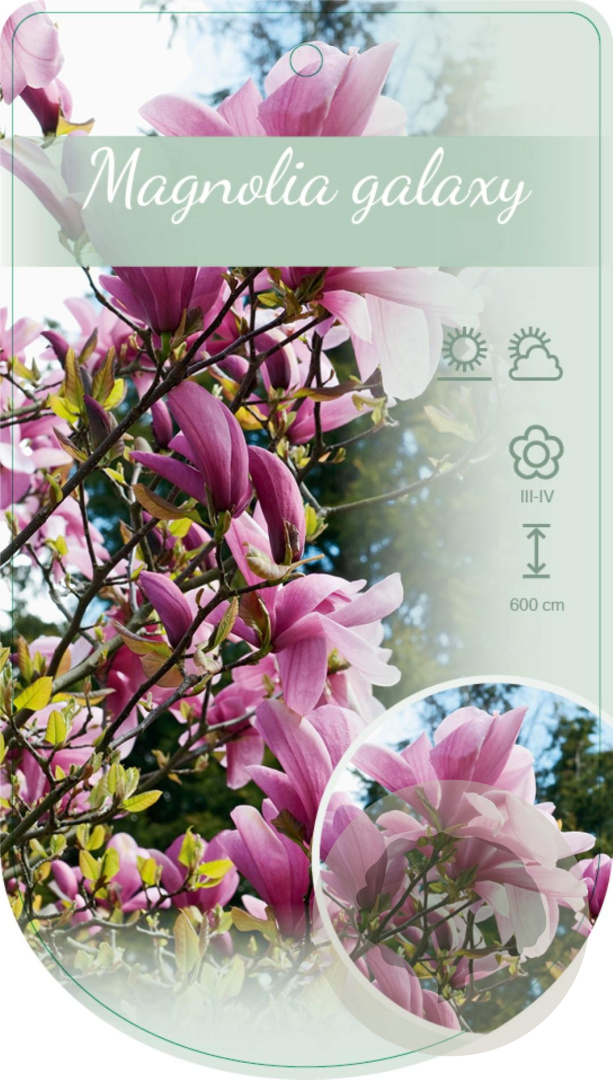 | Toelichting | De Beverboom (Magnolia 'Galaxy') is een prachtige sierheester met paarse bloemen in april en mei. Deze niet-inheemse plant gedijt het beste in zon of halfschaduw op zandgrond, neutrale grond of goede tuingrond. Bereikt een hoogte van 300 cm. |