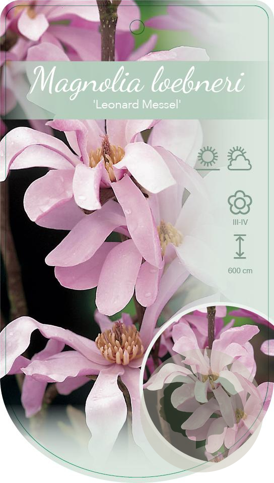 | Toelichting | De Beverboom (Magnolia loebneri 'Leonard Messel') is een prachtige sierheester met paars-witte bloemen in april en mei. Deze boom groeit het beste in zon en halfschaduw op zandgrond, lichte klei of neutrale grond. Bereikt een hoogte van 300 cm. |