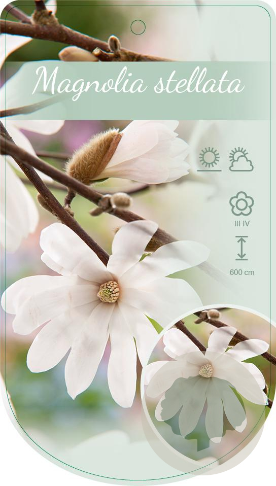 | Toelichting | De Stermagnolia is een prachtige struik met witte bloemen die in april en mei bloeien. De plant wordt ongeveer 200 cm hoog en gedijt goed in zonnige tot halfschaduwrijke plekken op zandgrond, lichte klei of neutrale grond. |