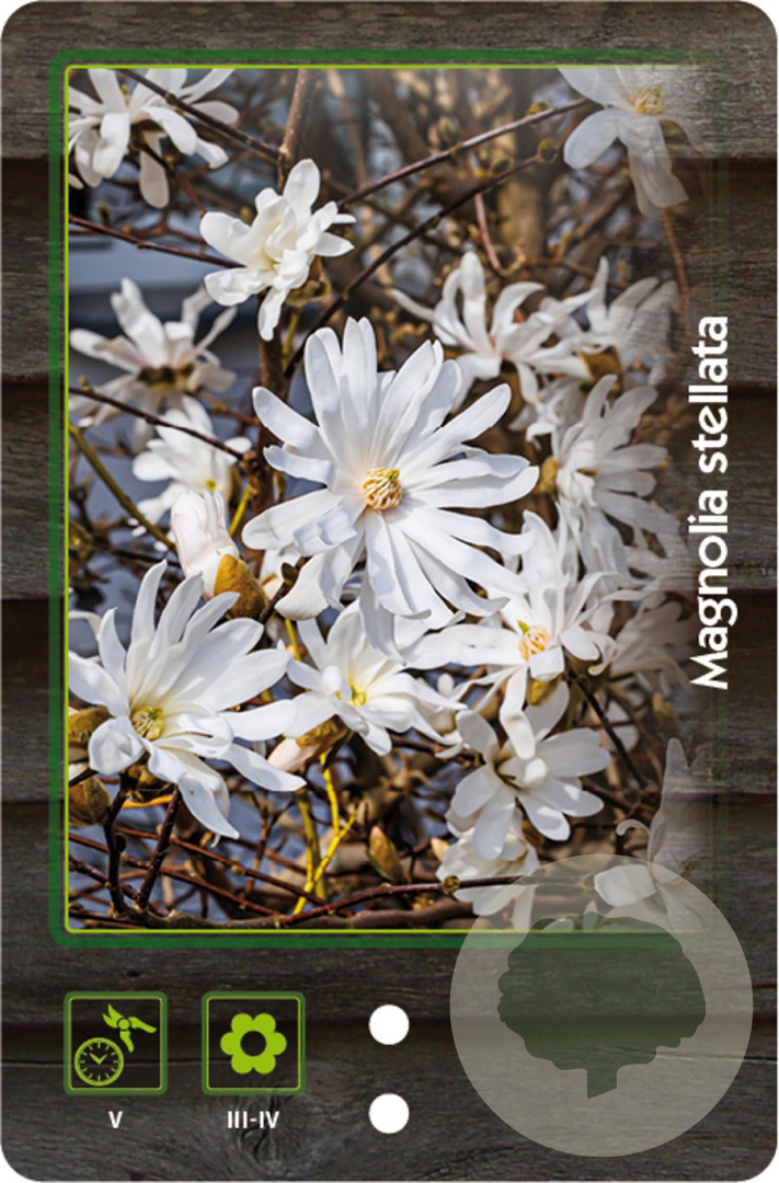 | Toelichting | De Stermagnolia is een prachtige struik met witte bloemen die in april en mei bloeien. De plant wordt ongeveer 200 cm hoog en gedijt goed in zonnige tot halfschaduwrijke plekken op zandgrond, lichte klei of neutrale grond. |