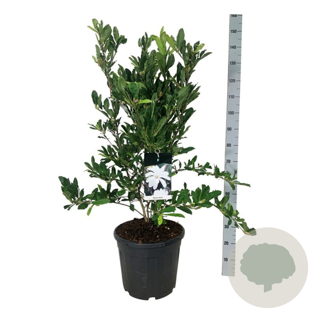 | Toelichting | De Stermagnolia is een prachtige struik met witte bloemen die in april en mei bloeien. De plant wordt ongeveer 200 cm hoog en gedijt goed in zonnige tot halfschaduwrijke plekken op zandgrond, lichte klei of neutrale grond. |
