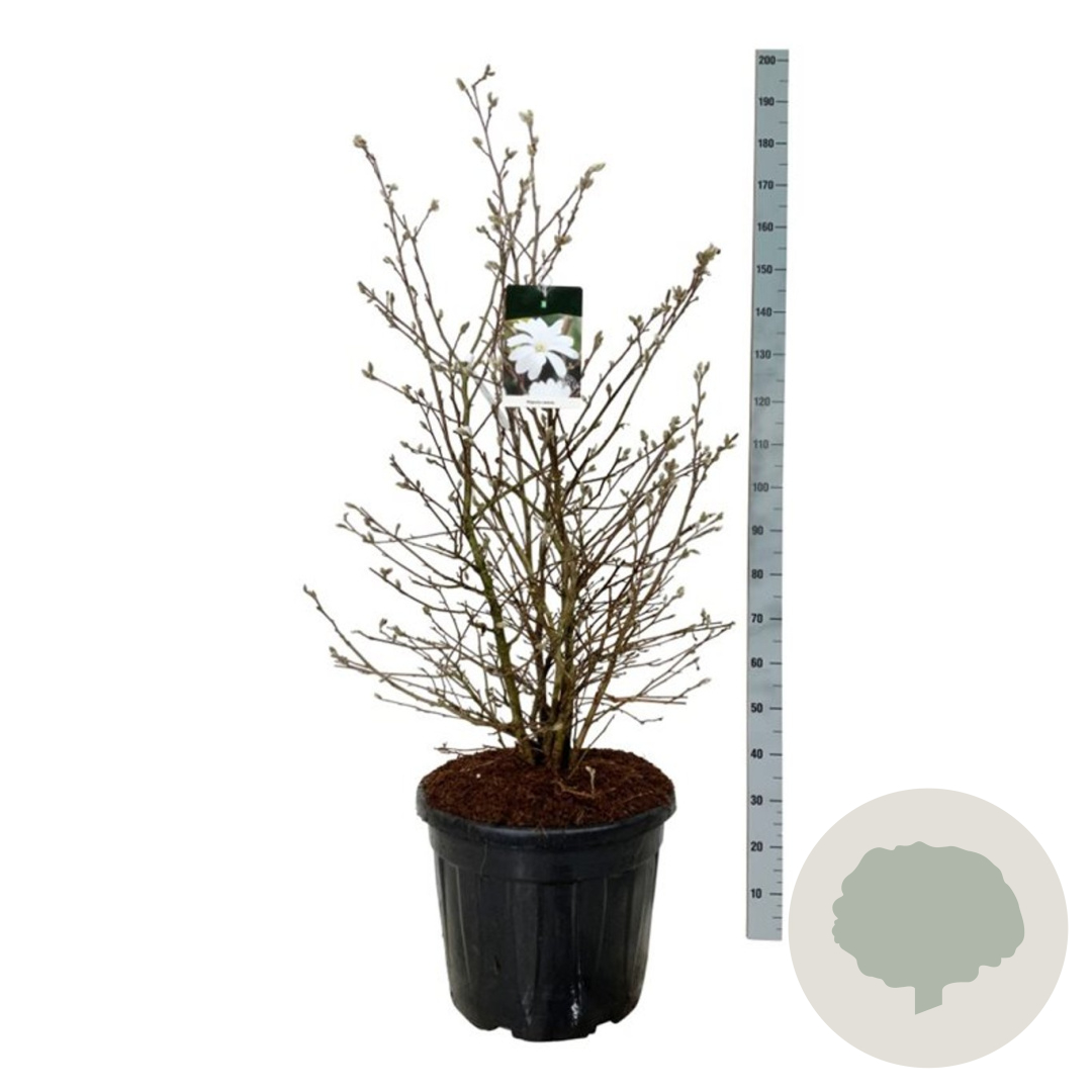 | Toelichting | De Stermagnolia is een prachtige struik met witte bloemen die in april en mei bloeien. De plant wordt ongeveer 200 cm hoog en gedijt goed in zonnige tot halfschaduwrijke plekken op zandgrond, lichte klei of neutrale grond. |