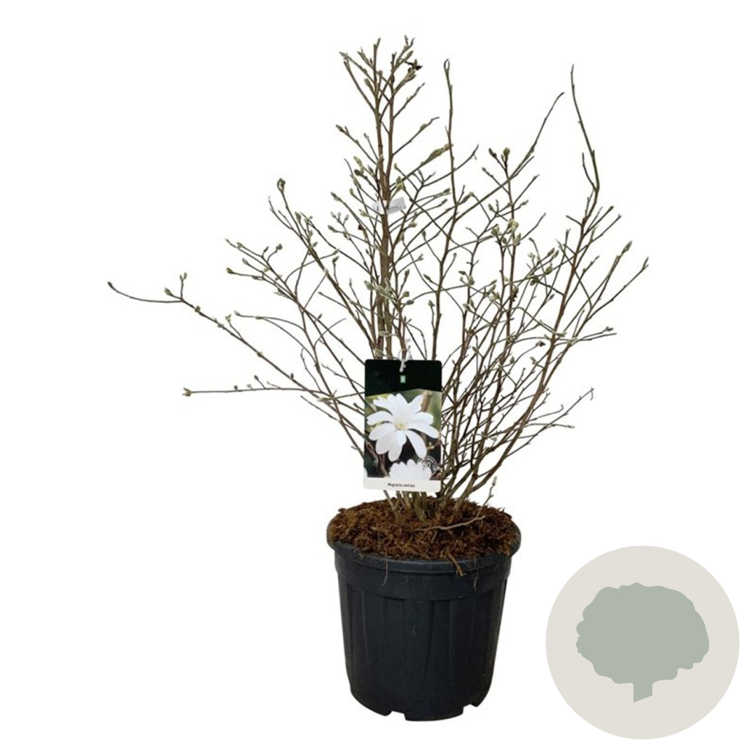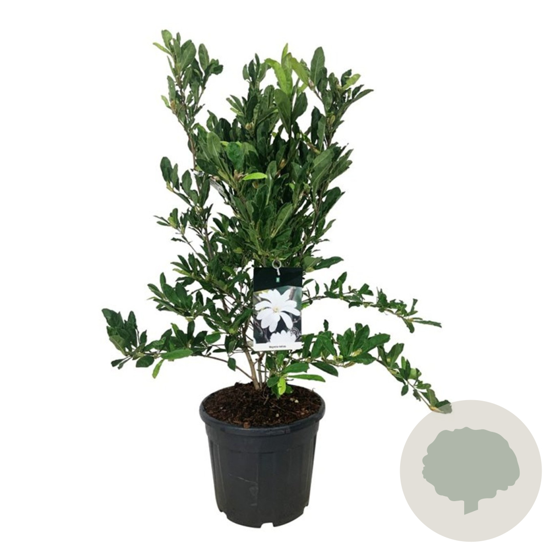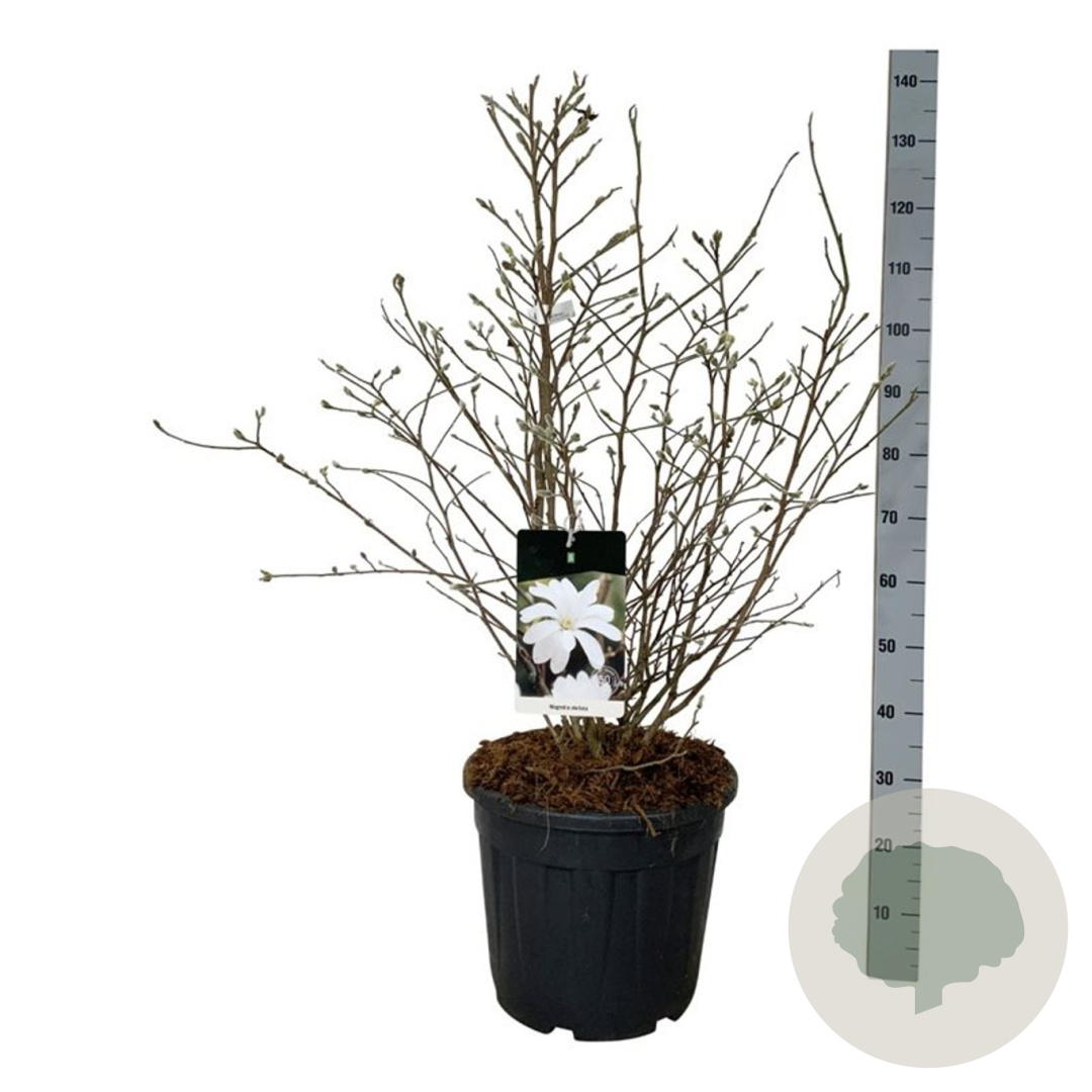 | Toelichting | De Stermagnolia is een prachtige struik met witte bloemen die in april en mei bloeien. De plant wordt ongeveer 200 cm hoog en gedijt goed in zonnige tot halfschaduwrijke plekken op zandgrond, lichte klei of neutrale grond. |