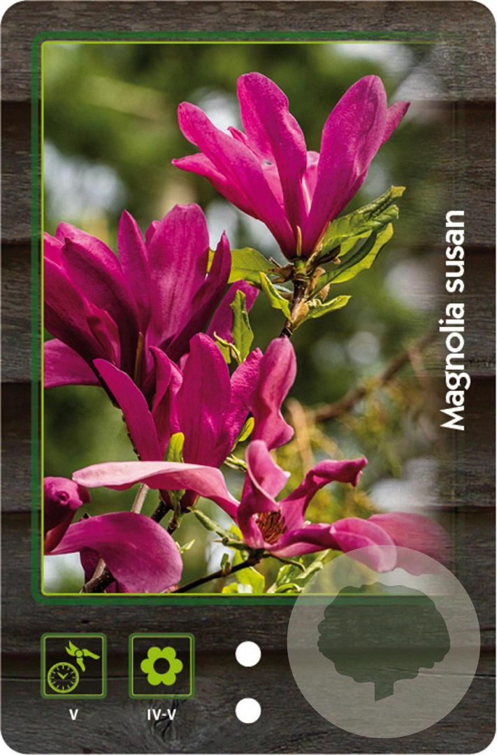 | Toelichting | De Beverboom (Magnolia 'Susan') is een prachtige struik met paarse bloemen in april en mei. Deze niet-inheemse plant gedijt goed in zon en halfschaduw op zandgrond, lichte klei of neutrale grond. Bereikt een volwassen hoogte van 300 cm. |
