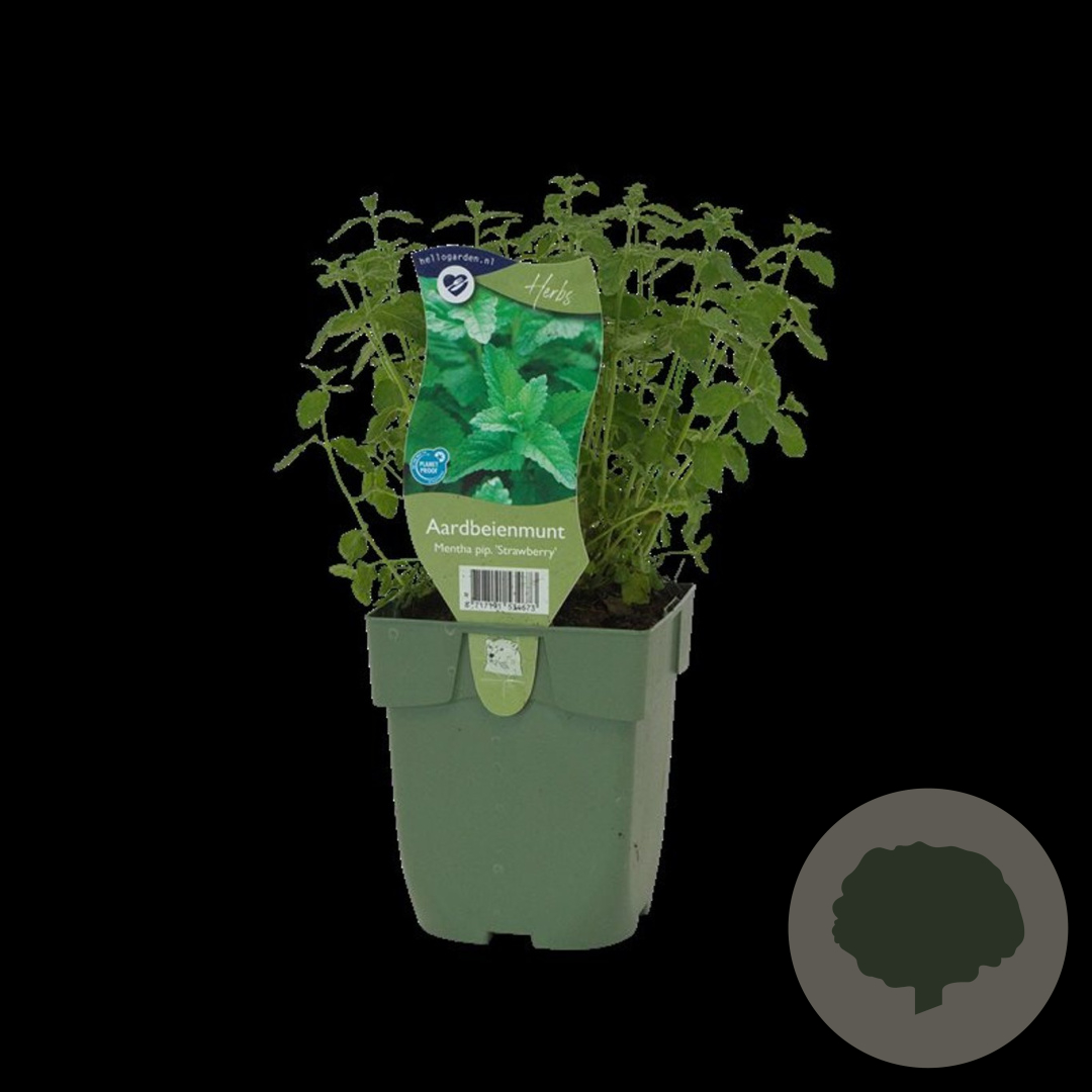 ToelichtingAardbeimunt (Mentha pip. 'Strawberry') is een heerlijk geurende muntsoort met paarse bloemen en groen blad. Deze plant bloeit van juli tot september en gedijt goed in zon en halfschaduw op neutrale, voedselrijke en humusrijke grond.