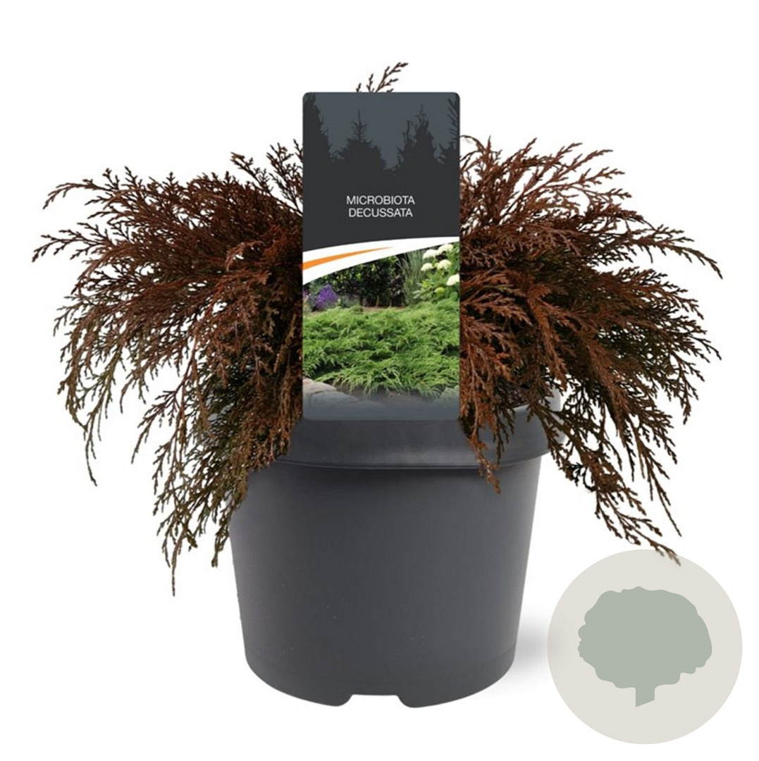 | Toelichting | De Siberische cipres (Microbiota decussata) is een prachtige groenblijvende conifeer met een hoogte van ongeveer 150 cm. De plant gedijt goed in zowel zon als halfschaduw en bloeit in de maanden mei tot juni. Perfect voor zandgrond, lichte klei en neutrale grond. |