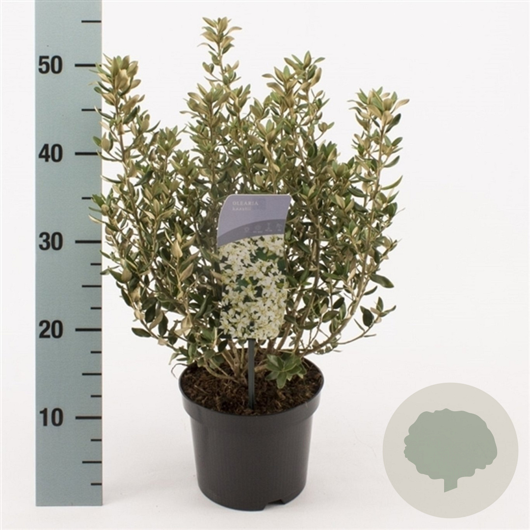 ToelichtingOlearia, ook wel bekend als 'Schijnhulst', is een prachtige struik met witte bloemen en groen blad. Deze plant bloeit in de zomermaanden juni en juli en gedijt goed in zonnige tot halfschaduwrijke omgevingen op zandgrond, lichte klei of neutrale grond.
