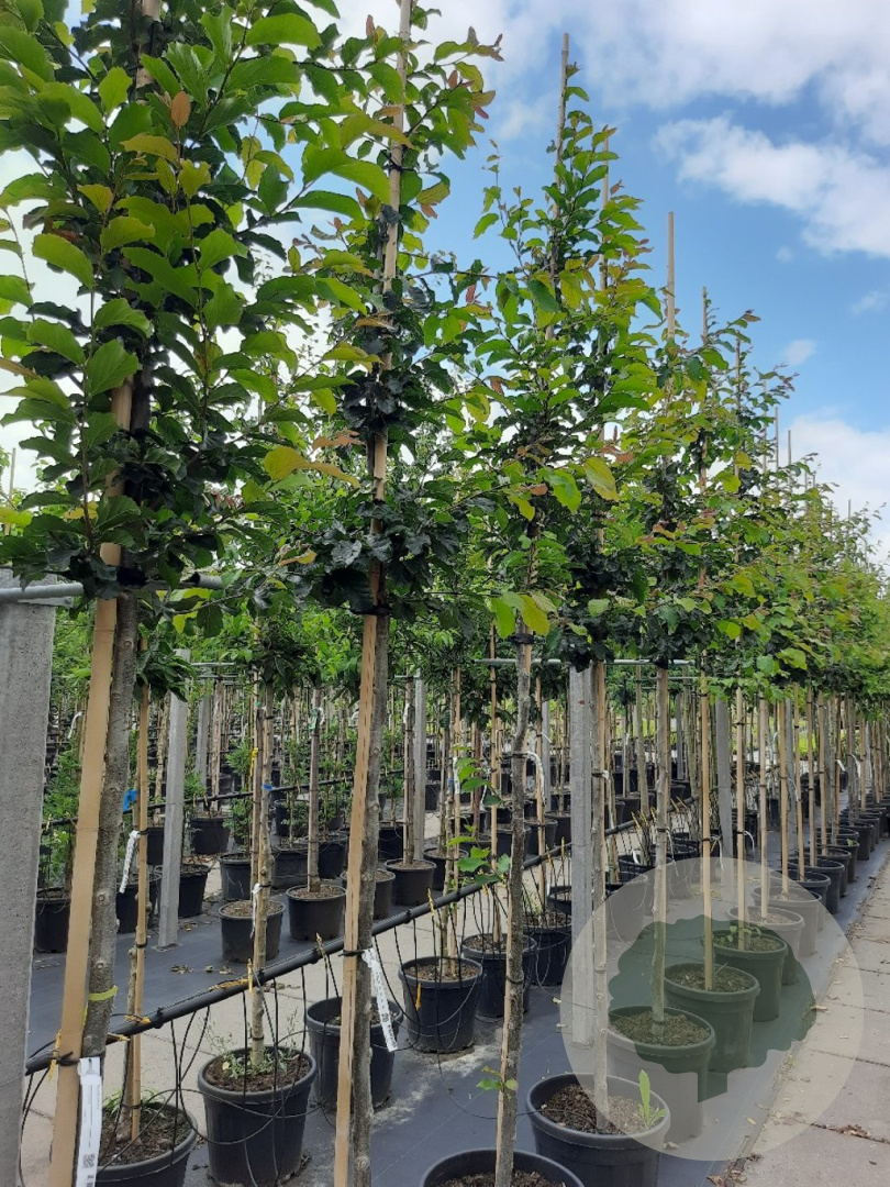 Parrotia persica (Perzisch ijzerhout) kopen? Hoogstam solitairboom 10-12 cm stamomtrek, containergekweekt. Bijzondere boom met kleurrijke herfstverkleuring en decoratieve schors.