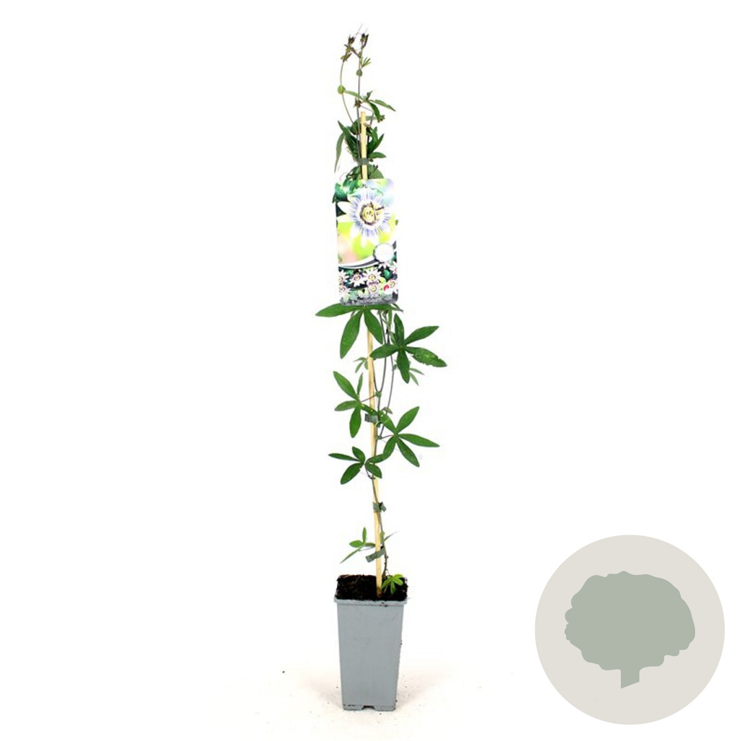 | Toelichting | De Blauwe passiebloem is een prachtige klimplant met paars-witte bloemen die bloeien van juni tot september. Deze plant gedijt het beste in zon of halfschaduw op zandgrond, lichte klei of neutrale grond. |