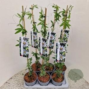ToelichtingDe Blauwe passiebloem is een prachtige klimplant met paars-witte bloemen die bloeien van juni tot september. Deze plant gedijt het beste in zon of halfschaduw op zandgrond, lichte klei of neutrale grond.