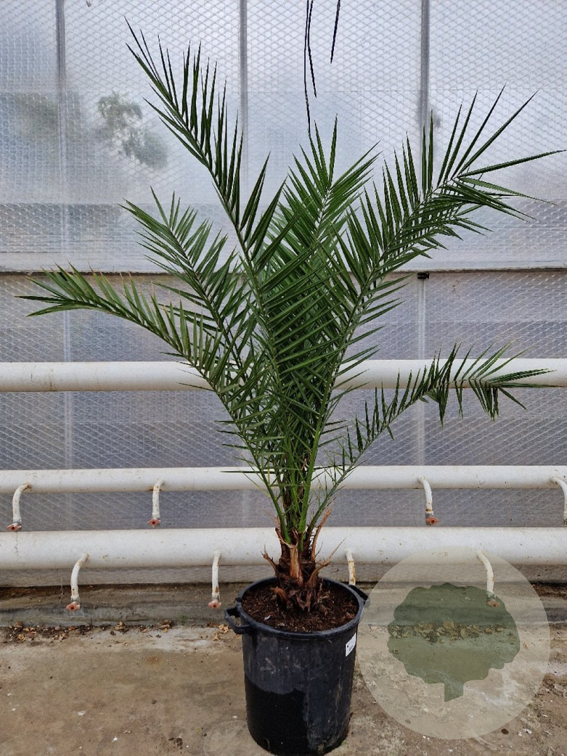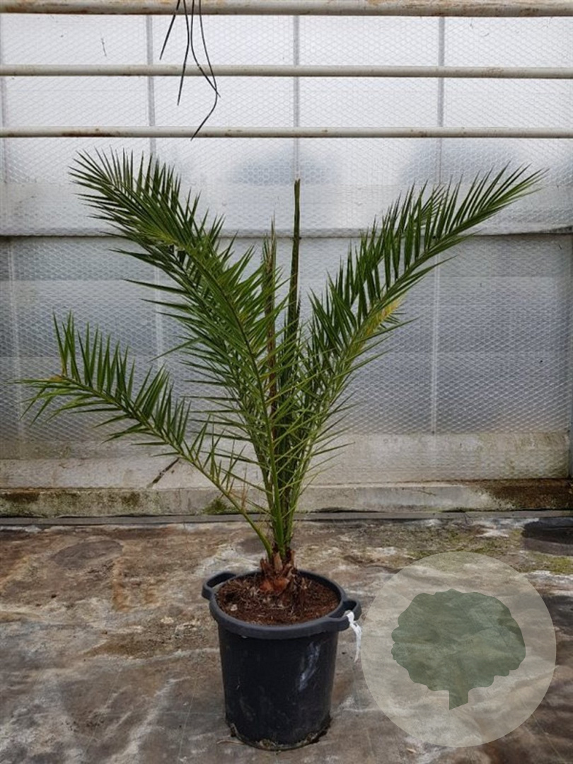 ToelichtingDe Canarische dadelpalm (Phoenix canariensis) is een imposante palmboom met groene bladeren en een hoogte tot wel 8 meter. Deze palm gedijt het beste in de volle zon op verschillende grondsoorten, zoals zandgrond, klei en zure grond.