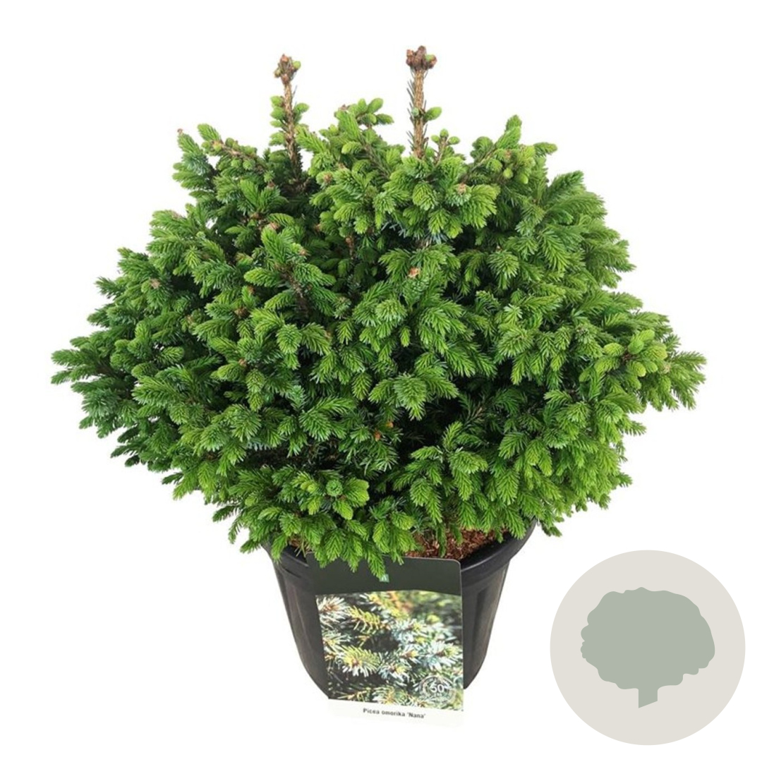 | Toelichting | De Servische spar, ook wel bekend als Picea omorika 'Nana', is een compacte conifeer met groen blad. Deze dwergspar bereikt een hoogte van ongeveer 150 cm en gedijt goed in zonnige tot halfschaduwrijke omgevingen op neutrale of zandgrond. |
