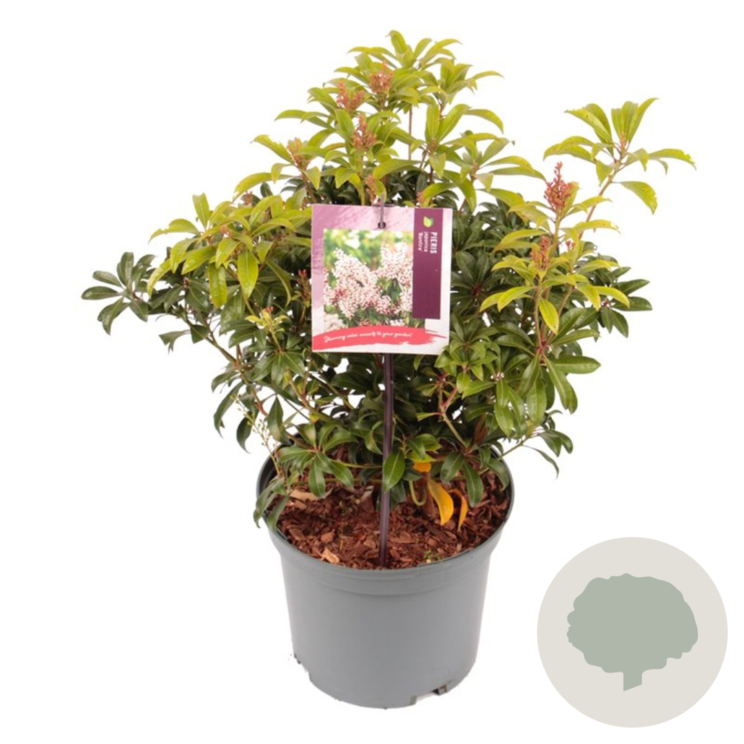 | Toelichting | De Pieris japonica 'Bonfire', ook wel bekend als Rotsheide, is een prachtige struik met donkergroen blad en witte bloemen in maart - april. Deze plant gedijt goed in de halfschaduw op zure en humusrijke grond, en bereikt een hoogte van 150 cm. |