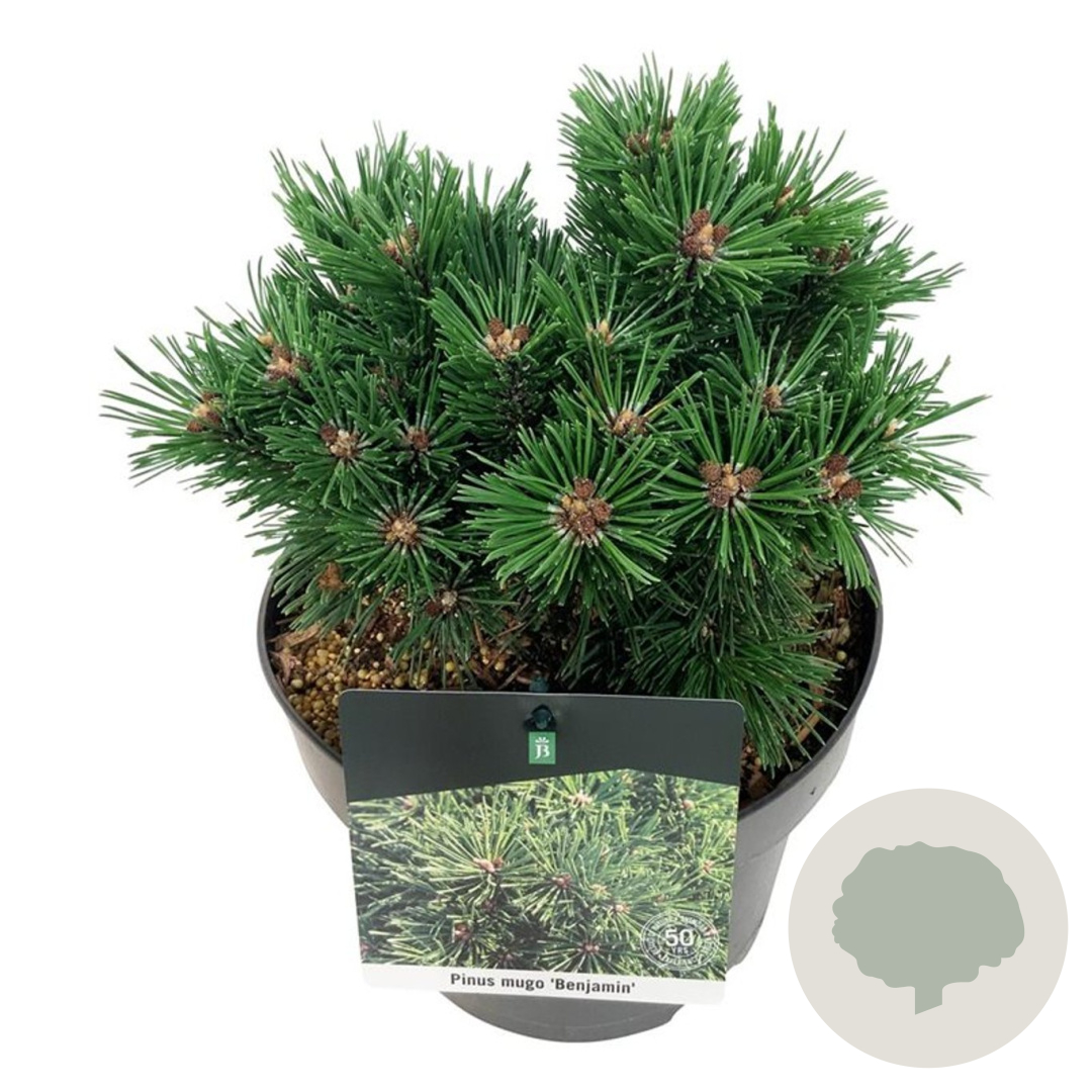 | Toelichting | De Dwergbergden (Pinus mugo 'Benjamin') is een compacte naaldboom met donkergroen blad. Deze dwergvorm bereikt een hoogte van 150 cm en gedijt goed in zonnige standplaatsen op zandgrond, lichte klei of droge zandgrond. |
