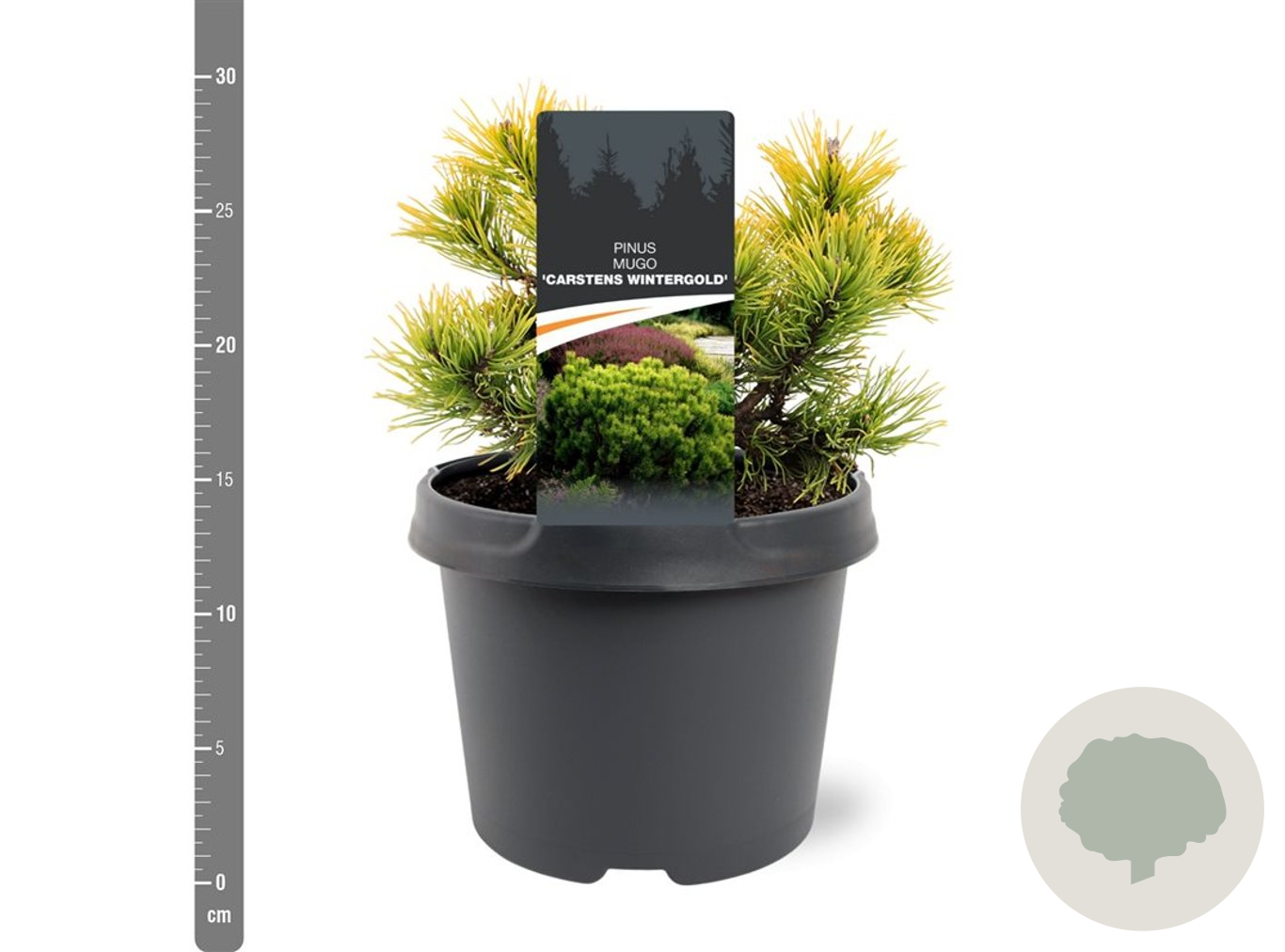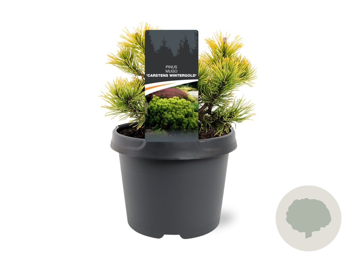 | Toelichting | De Dwergbergden (Pinus mugo 'Carsten's Wintergold') is een compacte naaldboom met groen blad en een volwassen hoogte van 150 cm. Deze wintergroene plant gedijt goed in de volle zon op diverse grondsoorten. Perfect voor een zonnige tuin! |