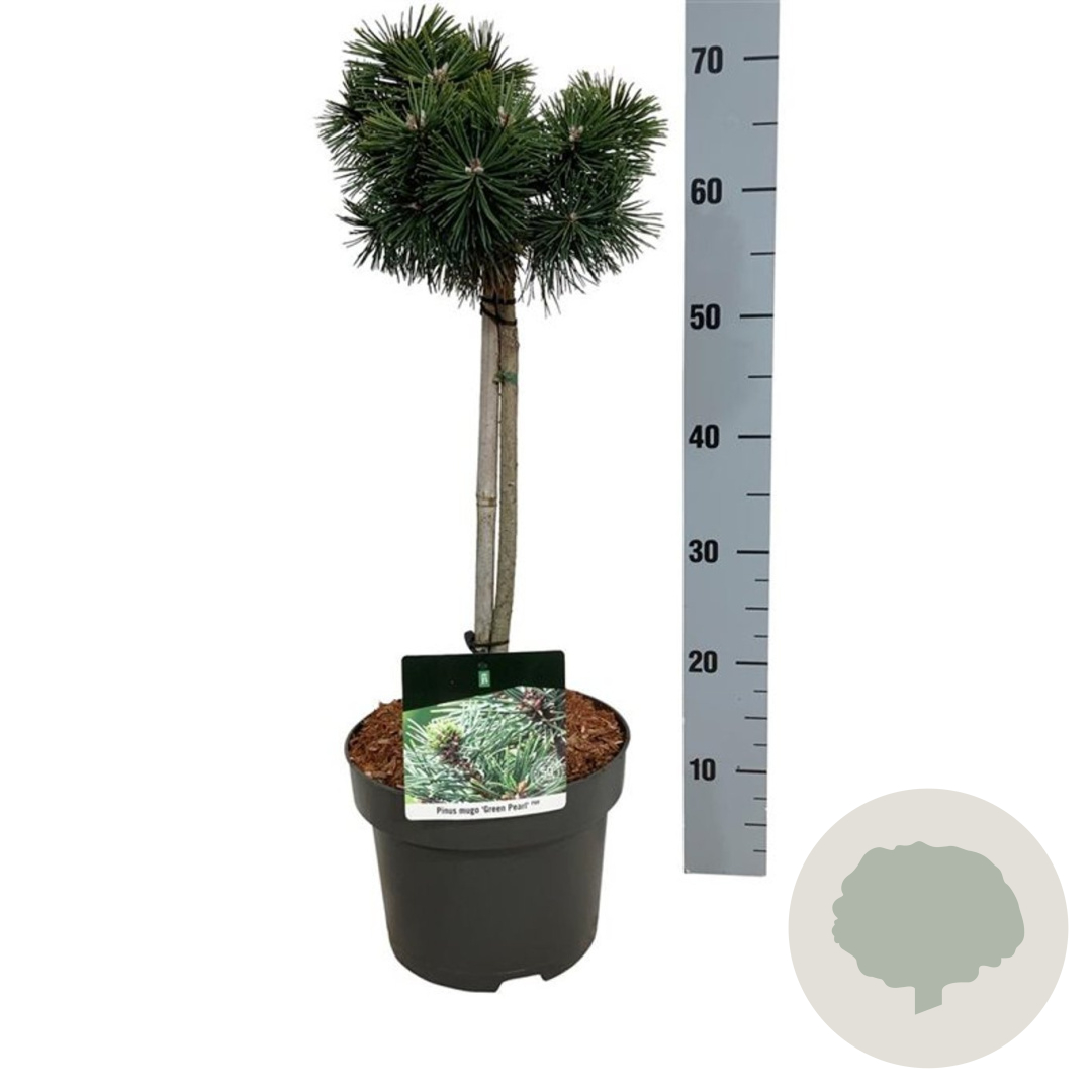 | Toelichting | De Dwergbergden (Pinus mugo 'Green Pearl') is een compacte naaldboom met groene bladeren en een volwassen hoogte van 150 cm. De boom bloeit in mei-juni en gedijt goed in zonnige standplaatsen op diverse grondsoorten. |