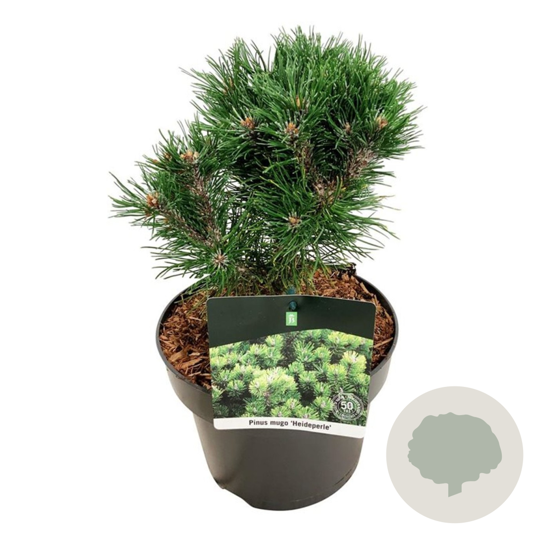 | Toelichting | De Dwergbergden (Pinus mugo 'Heideperle') is een compacte naaldboom met donkergroene naalden. Deze dwergvorm bereikt een hoogte van 100 cm en gedijt goed in zonnige standplaatsen op verschillende grondsoorten. Perfect voor kleine tuinen of rotstuinen. |