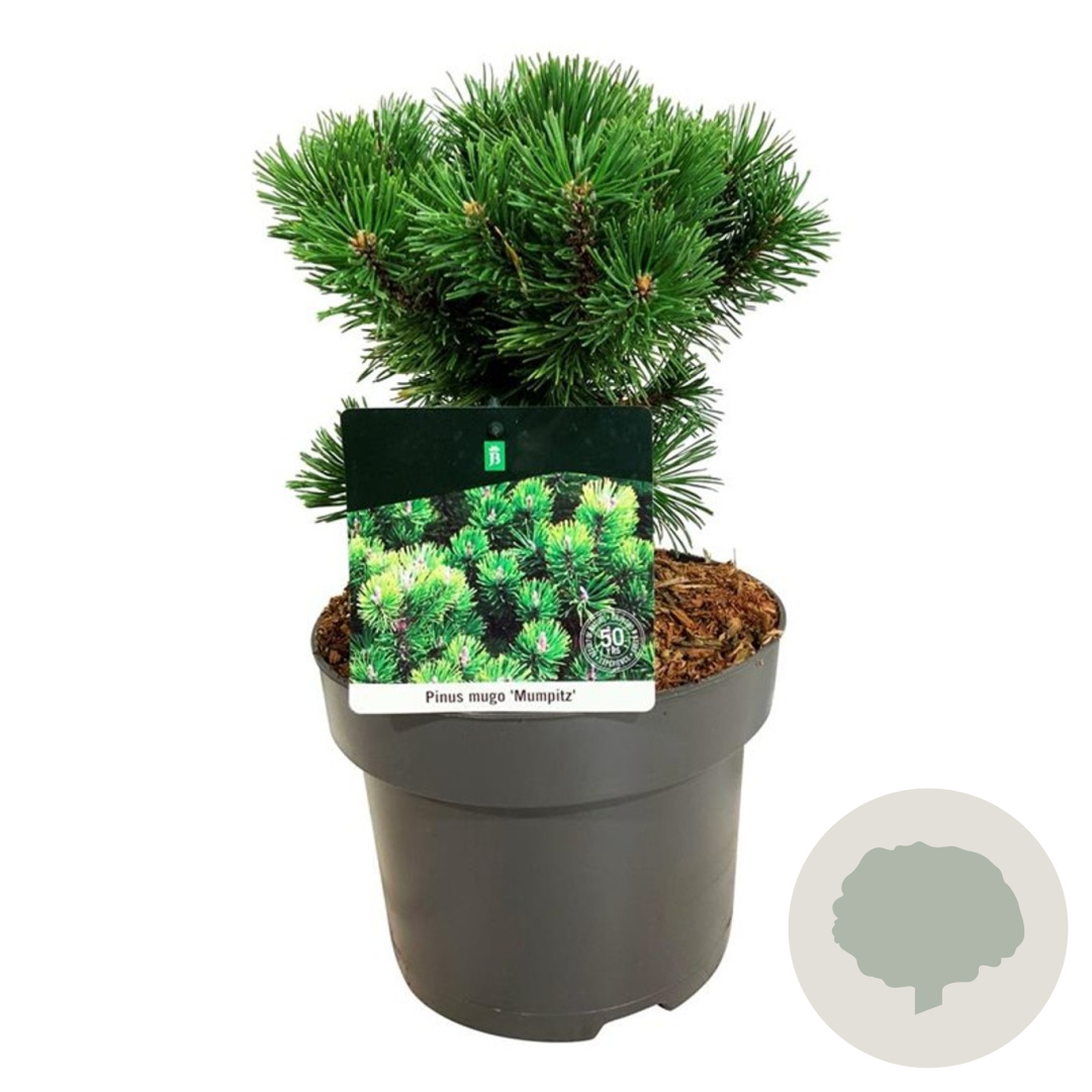| Toelichting | De Dwergbergden (Pinus mugo 'Mumpitz') is een compacte naaldboom met donkergroen blad. Deze dwergvorm bereikt een hoogte van 100 cm en gedijt goed in zonnige standplaatsen op zandgrond, klei of neutrale grond. |