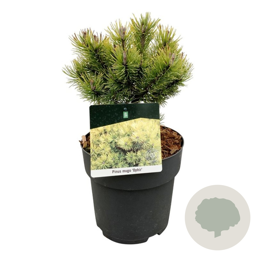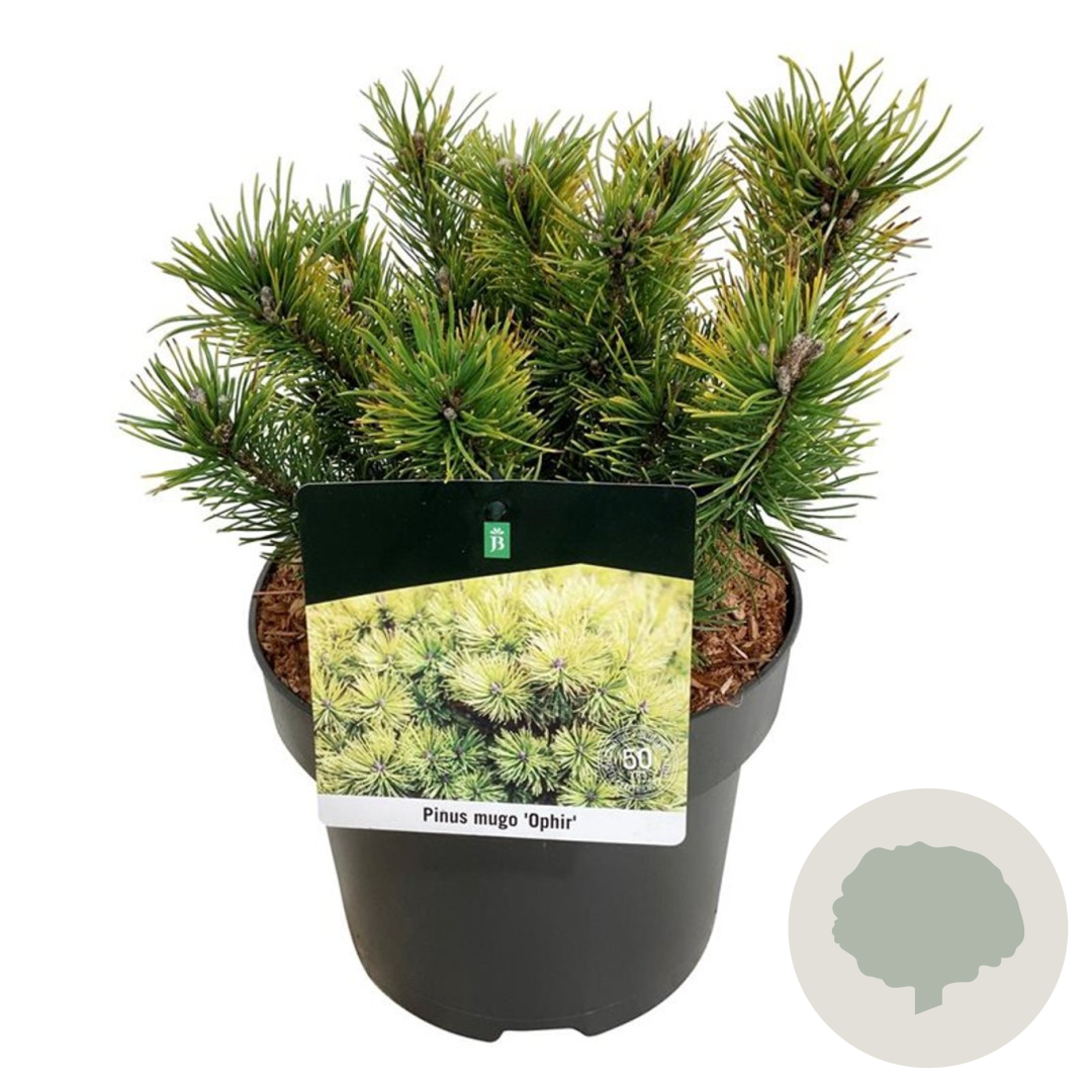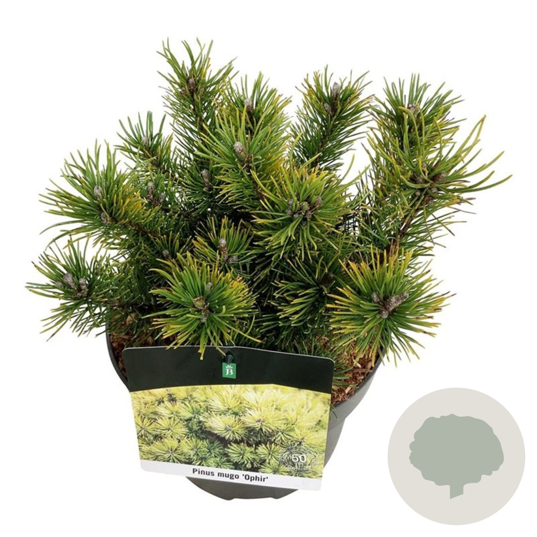 | Toelichting | De Dwergbergden 'Ophir' is een compacte naaldboom met groen blad en een volwassen hoogte van 150 cm. Bloeit in mei - juni en gedijt goed in zonnige standplaatsen op zandgrond, lichte klei of droge zandgrond. |