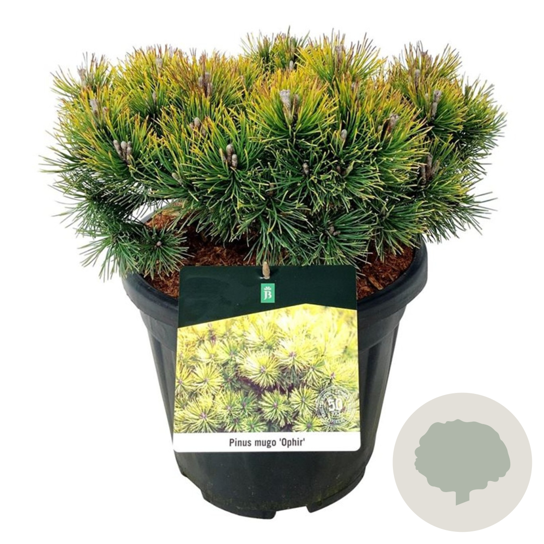 | Toelichting | De Dwergbergden 'Ophir' is een compacte naaldboom met groen blad en een volwassen hoogte van 150 cm. Bloeit in mei - juni en gedijt goed in zonnige standplaatsen op zandgrond, lichte klei of droge zandgrond. |