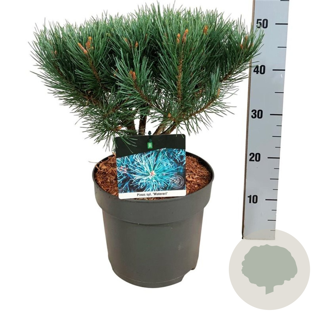 | Toelichting | De Dwergblauwspar (Pinus sylv. 'Watereri') is een compacte naaldboom met groen blad en een volwassen hoogte van 150 cm. Deze sierlijke boom gedijt goed in zon en halfschaduw op zandgrond, klei of neutrale grond. |