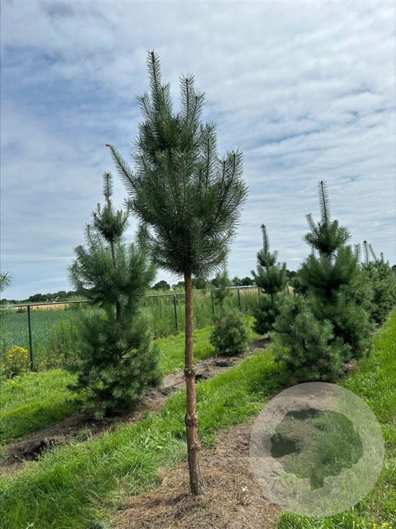 Pinus sylvestris (grove den, vliegden) kopen? Hoogstam 12–14 cm, gekweekt in container. Wintergroene solitairboom met roodbruine stam en blauwgroene naalden.