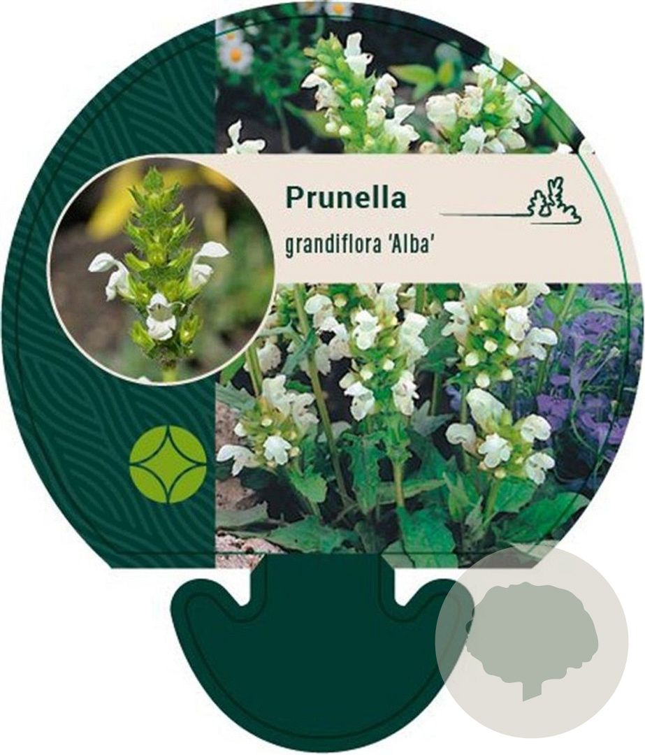 | Toelichting | Helmkruid (Prunella grand. 'Alba') is een laagblijvende vaste plant met witte bloemen en groen blad. Bloeit van mei tot augustus en gedijt goed in zon en halfschaduw op neutrale, goede tuingrond. Perfect voor borders en rotstuinen. |
