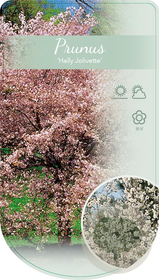 | Toelichting | De Kerspruim 'Hally Jolivette' is een prachtige sierboom met witte bloemen in april en mei. De boom wordt ongeveer 200 cm hoog en gedijt goed in zonnige tot halfschaduwrijke plekken met lichte klei en neutrale grond. |