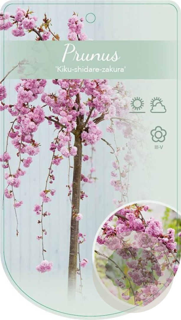 | Toelichting | De Treursierkers (Prunus 'Kiku-shidare-zakura') is een prachtige sierboom met hangende takken en roze bloemen in het voorjaar. Deze boom wordt ongeveer 200 cm hoog en bloeit van april tot mei. Plant op een zonnige tot halfschaduwrijke plek in zandgrond, lichte klei of neutrale grond. |