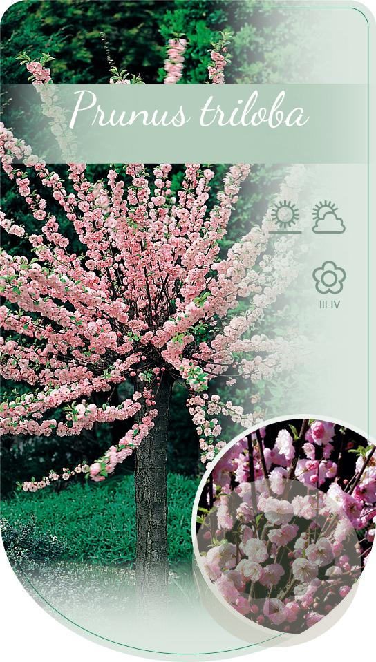 | Toelichting | Het Amandelboompje (Prunus triloba) is een prachtige sierheester met roze bloemen in de lente. Deze compacte struik bereikt een hoogte van 200 cm en gedijt het beste in de volle zon op zandgrond, lichte klei of neutrale grond. |