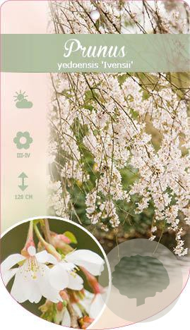 | Toelichting | De Japanse sierkers 'Ivensii' is een prachtige sierboom met roze bloemen in april en mei. De boom kan tot 300 cm hoog worden en gedijt goed in zon en halfschaduw op zand- of neutrale grond. |